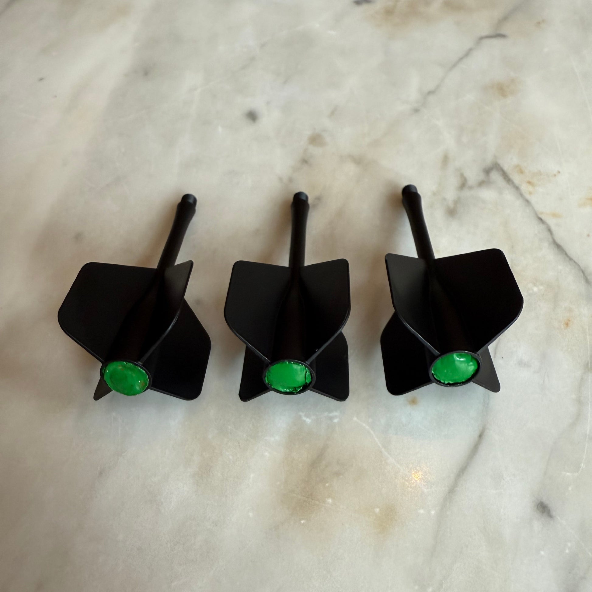 Three Robinhood Darts Flights with 6 extra foam inserts. Standard 2BA threading to fit standard steel dart barrels and tips. The target area at the rear of the flight is 3/8 inch diameter, a smaller target than our easier 1/2 darts. Flights available in Green or Black, both come with green and red foam inserts. (Not for soft tip darts)